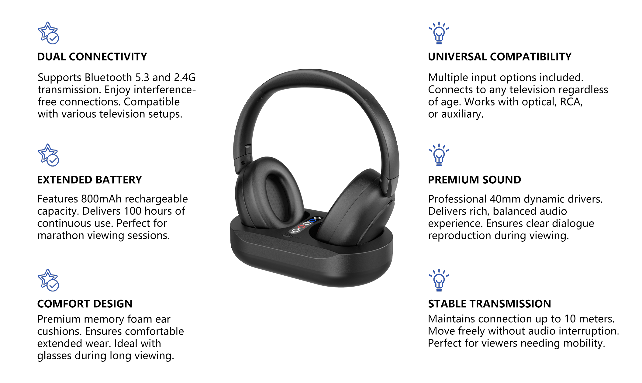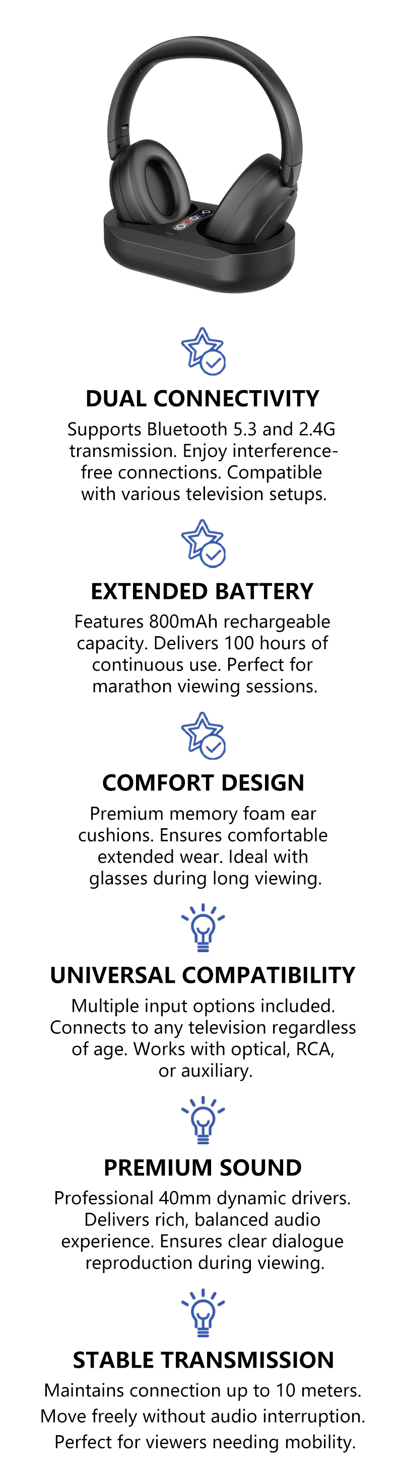 - Bluetooth 5.3 with TV transmitter — Ensures a stable, reliable wireless connection every time.