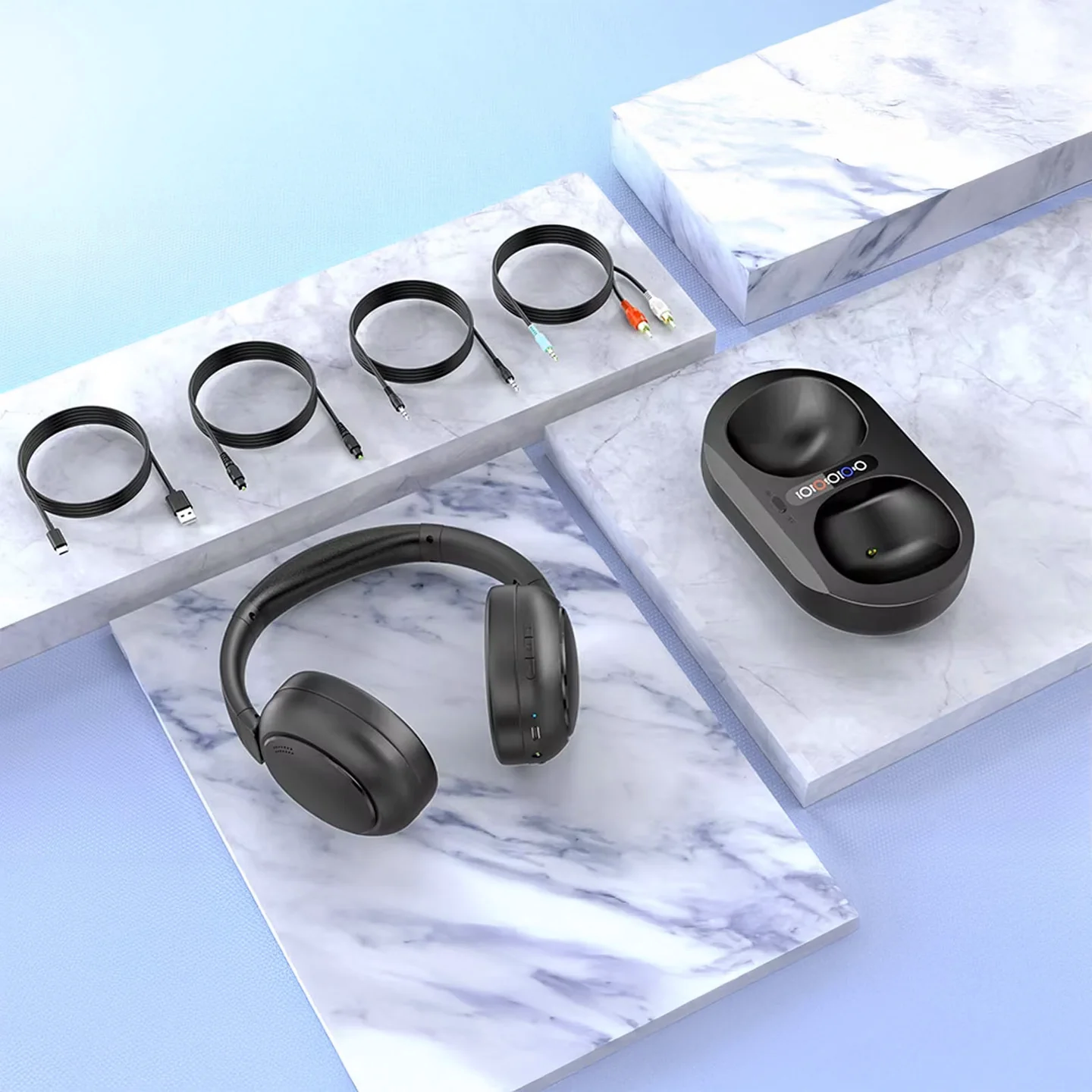 - Charging dock transmitter — The transmitter also stores and charges the headphones for effortless use.