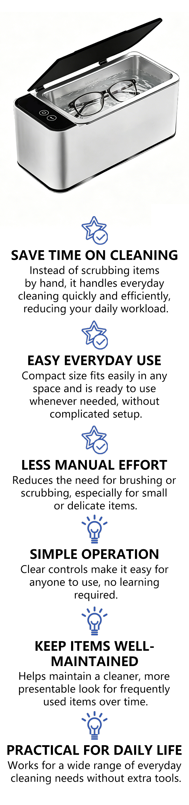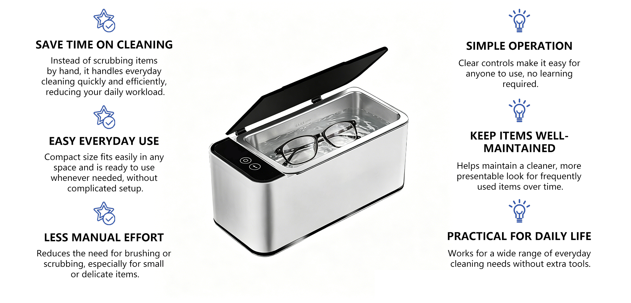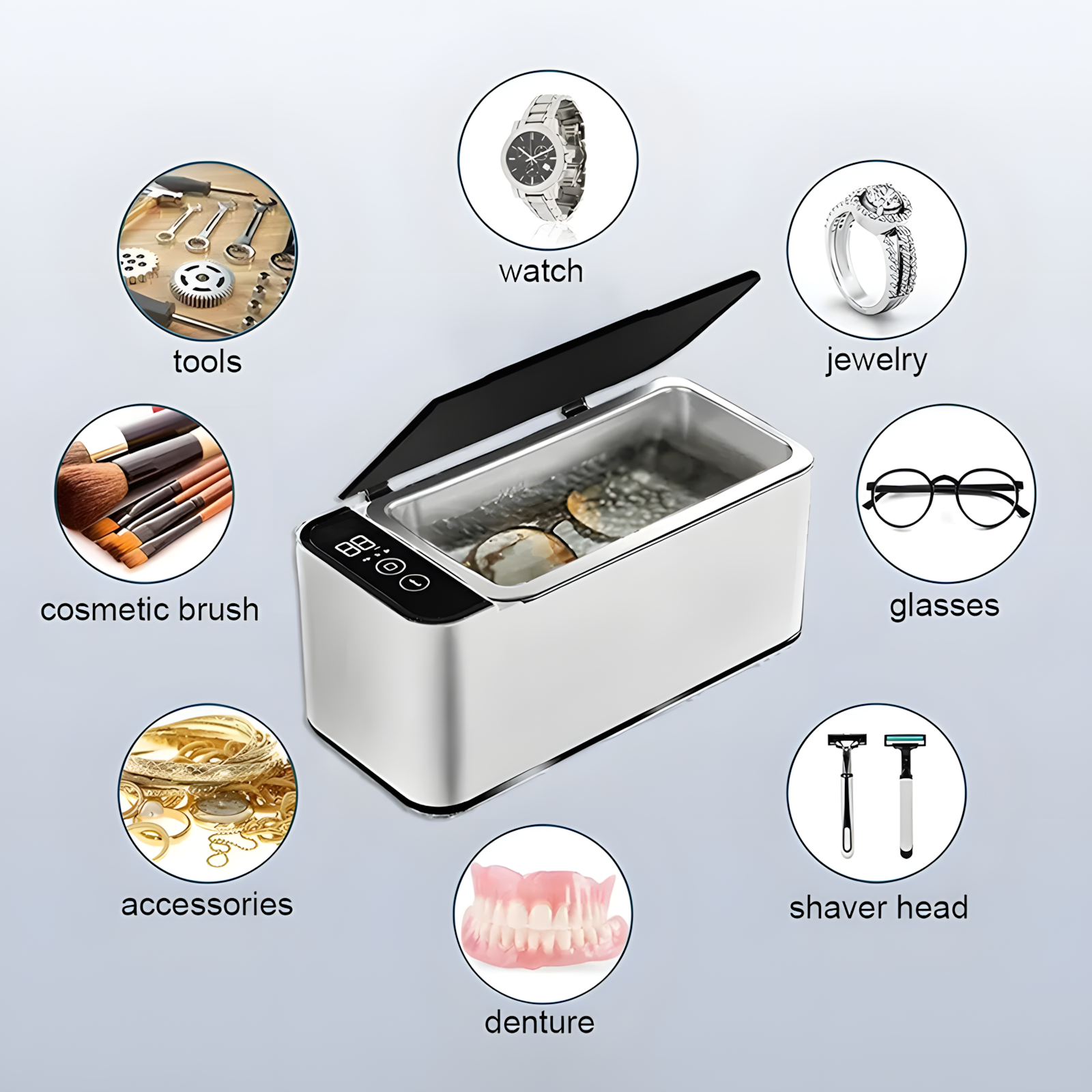 Versatile ultrasonic cleaning performance suitable for multiple daily essentials, helping remove dirt, grease, and buildup from different materials and shapes. From small accessories to personal items, it delivers a more consistent and convenient cleaning experience.